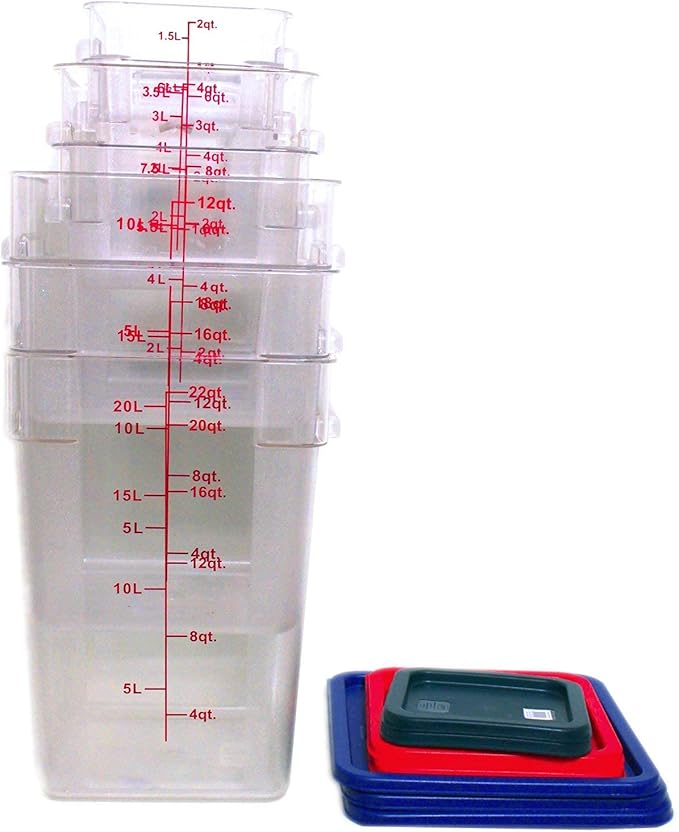 - SET INCLUDES: 1 of 2 Qt., 4 Qt., 6 Qt., 8 Qt., 12 Qt., 18 Qt. And 22 Quart. . Color-coded snap-tight polyethylene cover locks in foods’ freshness and protects it against outside contaminants.