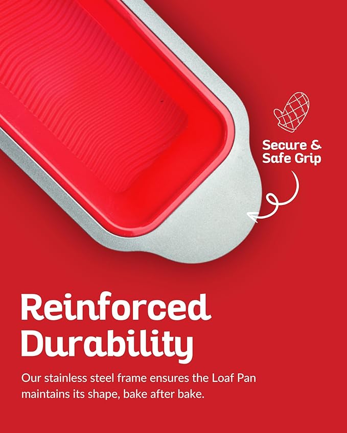 - NON-STICK SILICONE – This 9x5 loaf pans for baking bread features textured surface for no-mess release, easy to clean, dishwasher safe; Food-grade red silicone, BPA-free; safe in oven and freezer.