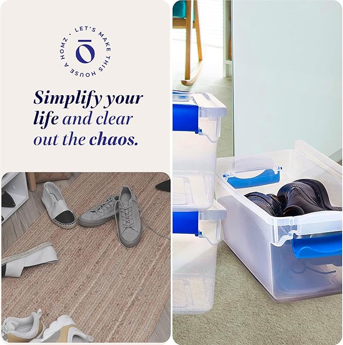 HOMZ 5-Pack Latching Lid, Clear Plastic Storage Organizer Bins, 7.5 Quart, Blue Latch - Stackable Organizing Containers for Home, Garage, and Office