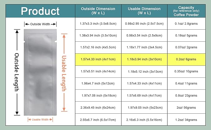 - The size you see is the outside dimension of the bag and the available dimension is about (outer wide - 0.4 inch) x (outer length - 0.4 inch); 3.34 mil( one side) thickness