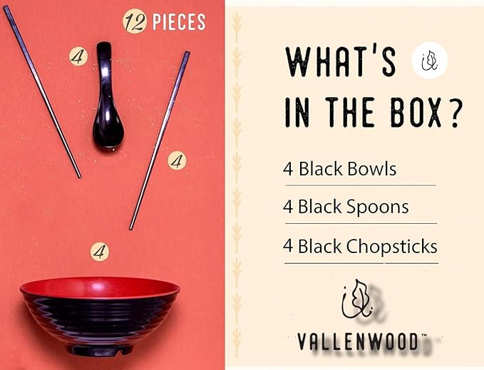 4 Ramen Bowls, 12 pieces Pho set. Red Black Ramen Bowl Set. Unbreakable Melamine. Asian Japanese soup. Spoons And Chopsticks kit. . XL 37 oz. Noodles, Rice, Udon, Thai, Chinese, Korean, Wonton, Miso