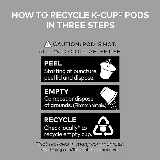- INTRODUCING RECYCLABLE K-CUP PODS: Simple. Delicious. And now Recyclable. Enjoy the same great-tasting coffee you know and love, and when you’re done just peel, empty and recycle. Check locally, not recycled in all communities. Packaging may vary.