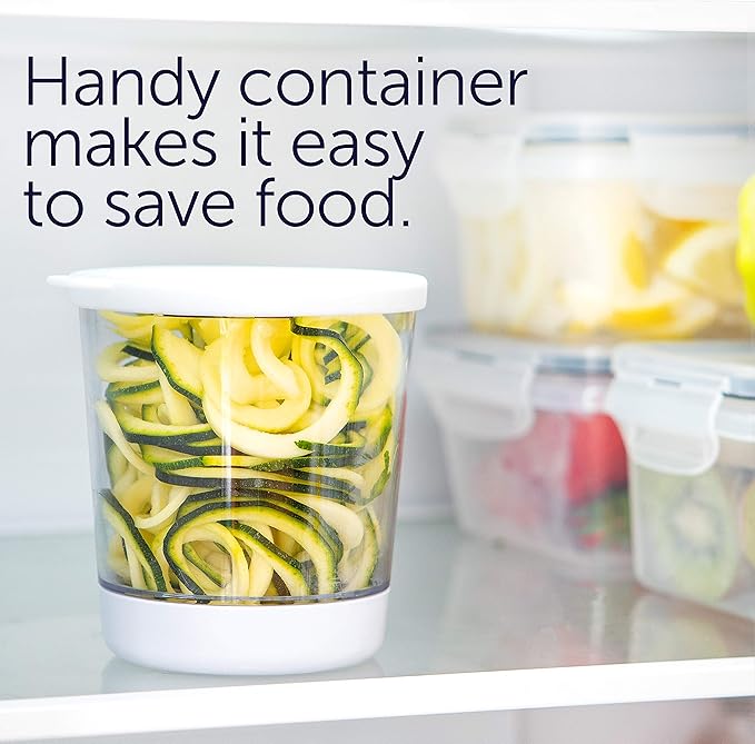 - Built-in Storage Container - Mess-free spiralizing with included catch container and lid. This cucumber slicer and veggie slicer keeps counters clean while you prep. Store fresh zucchini noodles directly in container for later use.