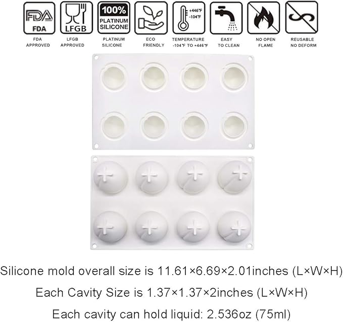 - ENJOY COOKING - The silicone chocolate mold overall size is 11.61x6.69x2.01inches (LxWxH), Each Cavity Size is 1.37x1.37x2inches (LxWxH), Each cavity can hold liquid: 2.536oz (75ml). Using multi-cavity silicone cake candy chocolate molds make your cooking easier