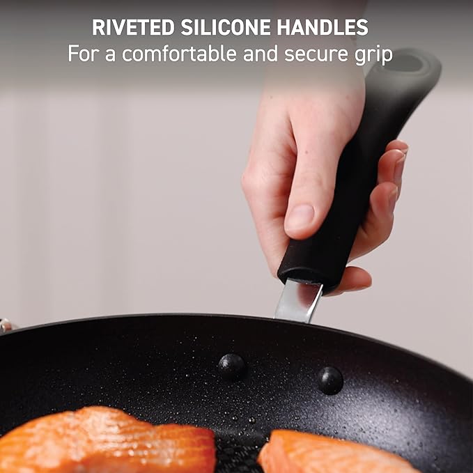 - Riveted handle & even heat base: riveted silicone handle is designed for Comfort and safety; even heat base ensures superior heat distribution for perfect results every meal