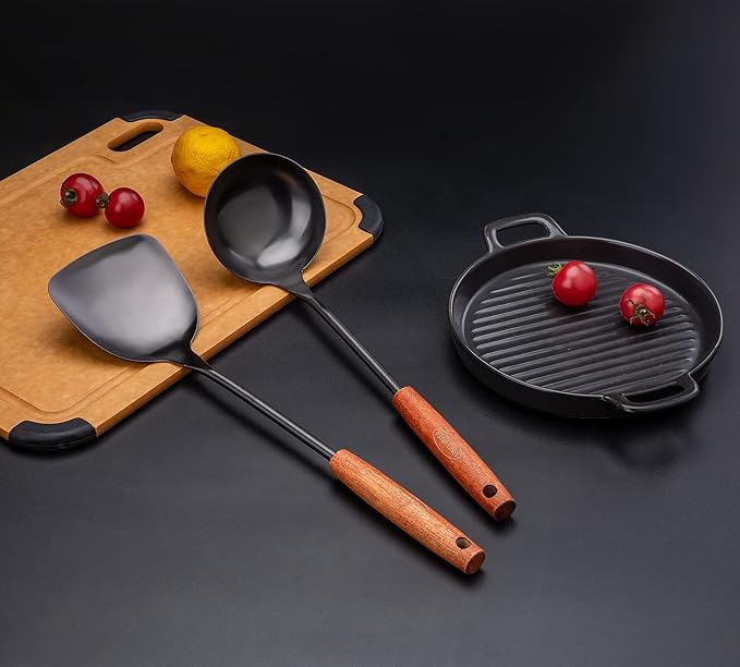 - 【Wok Spatula Material】: Using high temperature black plating technology.201 stainless steel & wood handle, durable, easy to clean, not easy to have dents, cracks, rust or fall off. Excellent workmanship, smooth edges and lines, the welding is superb