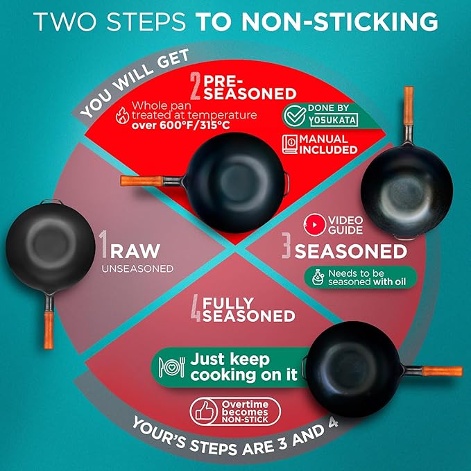 - PRE-SEASONED: : Unlike many stir fry pans, this carbon steel wok is pre-seasoned at over 600°F using advanced techniques, offering a better non-stick start right out of the box Like any traditional authentic wok, it will still require proper oil seasoning over time for the best natural non-stick layer performance. No synthetic coatings, this is a wok no PTFE – 100% safe and non-toxic.