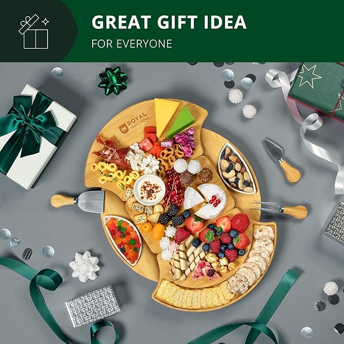 ROYAL CRAFT WOOD Large Round Cheese Board and Knife Set - Charcuterie Board, Bamboo Cheese Board Set, Cheese Tray Set, Wooden Cheese Plate Set 13.7 Inch
