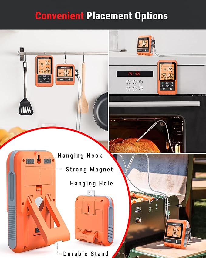 - 8 temp presets and BBQ mode: Kitchen thermometer for food features a HI/LOW temp setting to monitor the ambient temp of your oven/smoker/grill and know exactly when to add more fuel