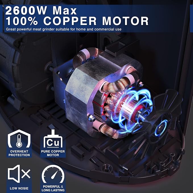 - [Powerful Motor] The meat grinder mechanical is using the 100% pure copper motor normal rated power up to 350W and the peak value can reach up to 2600 watt. Various meats and vegatables can be ground efficiently- opproximately 180 lbs meat/hour, great for saving your time and labor t grind it.