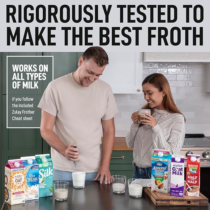 - PROVEN AND TRUSTED QUALITY: Made with high-quality materials, this coffee frother handheld works on all types of milk—whole, almond, soy, cashew, or cream. Backed by the Zulay Lifetime Guarantee, it won’t rust or break.