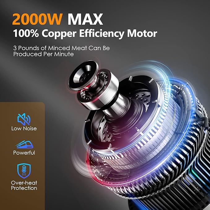 - [Powerful Motor] The meat grinder mechanical is using the 100% pure copper motor normal rated power up to 350W and the peak value can reach up to 2600 watt. Various meats and vegatables can be ground efficiently- opproximately 180 lbs meat/hour, great for saving your time and labor t grind it.