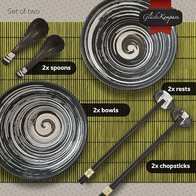 - Enjoy your ramen and soups in the authentic Japanese GlücksKompass Ramen Bowl Set. Experience the urban lifestyle, feel the serenity and balance and be one with yourself. The elegant, meticulously coordinated set consists of two ceramic bowls, two ceramic ramen spoons, two pairs of elegant chopsticks and, as the icing on the cake, two ceramic chopstick rests. With its original black and white swirly pattern, this set will bring you joy and contentment.