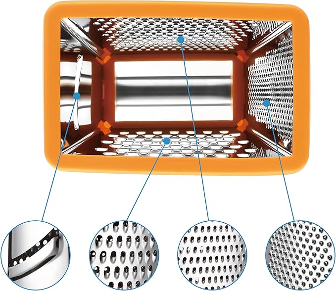 - Incredible Versatility With The 4 Sided Design: Consider getting rid of all the other graters and slicers you may own to make room for this. Coarse grating, Medium grating, Fine grating/Zester and even a Slicer - all in one convenient tool. Quickly prep an array of foods like cheese, potato, squash, zucchini, carrots, lemons and cucumbers. Multi-functional manual cheese grater with a comfortable handle that gives you total control.