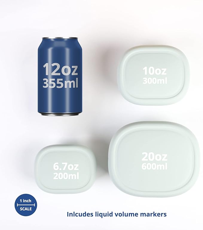 - Size - Each 3-pack set includes a 2.9" x 1.7" x 2.00" (6.7oz); 3.6" x 4.4" x 2" (10oz); 4.5" x 5.3" x 2.5" (20oz) silicone container with matching solid easy-to-clean silicone lids.