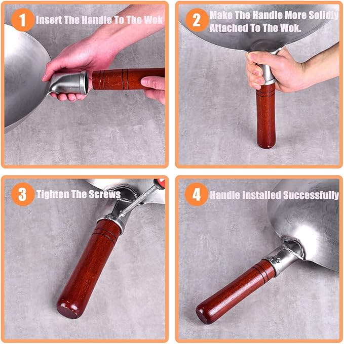 - EASY TO USE & STORE: Wok pan have steel helper handle and non-slip heat-resistant wooden handle, not only helpful for hanging the wok for storage, but also safe and comfortable to use. NOTE: The wooden handle of the frying pan needs to be installed manually, using screws to fix the wooden handle to the steel handle, Please refer to the manual for installation