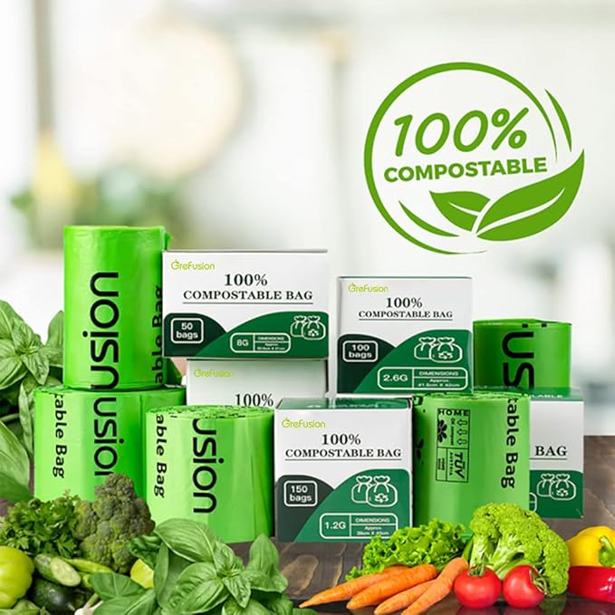 - 【SMALL COMPOST BAGS&UPDATE SUPER THICK 0.72 MIL】As GreFusion 2.6 gallon compostable bags are able to withstand a heavy load of food scraps without any ripping ,We are Proud of update the design of food Waste bags thick with 0.72 Mils for carry food waste and coffee grounds well,sturdy enough with less chance of perforation by sharp leaves to avoid create a mess in compost bin.These bin bags are strength enough to save amount of compostable item and keep trash can clean.