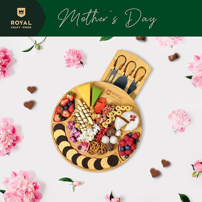 ROYAL CRAFT WOOD Bamboo Cheese Large Round Board and Knife Set with Charcuterie Board & Serving Tray Non - Expandable