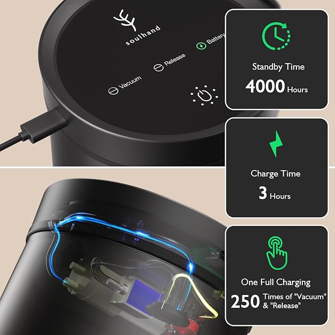 - SMART & SUPER-LONG STANDBY: No manual twisting or pressing is needed to activate the vacuum seal! Our coffee canister can remove air by tapping the top of the lid. It fully charges in 3 hours and can continuously turn on and off 300 times and last for 6 months. Soulhand coffee storage container's unique automatic sealing system will constantly monitor the air pressure inside the container and automatic air exhaust.