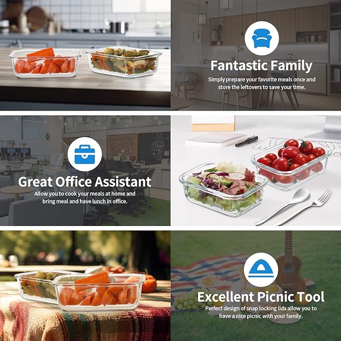 - [Oven, Microwave, Freezer Safe] Durable borosilicate glass containers designed to go from freezer to oven, containers are great for meal prep, leftovers, cabinet storage, and more, make meal prep simple and easy.