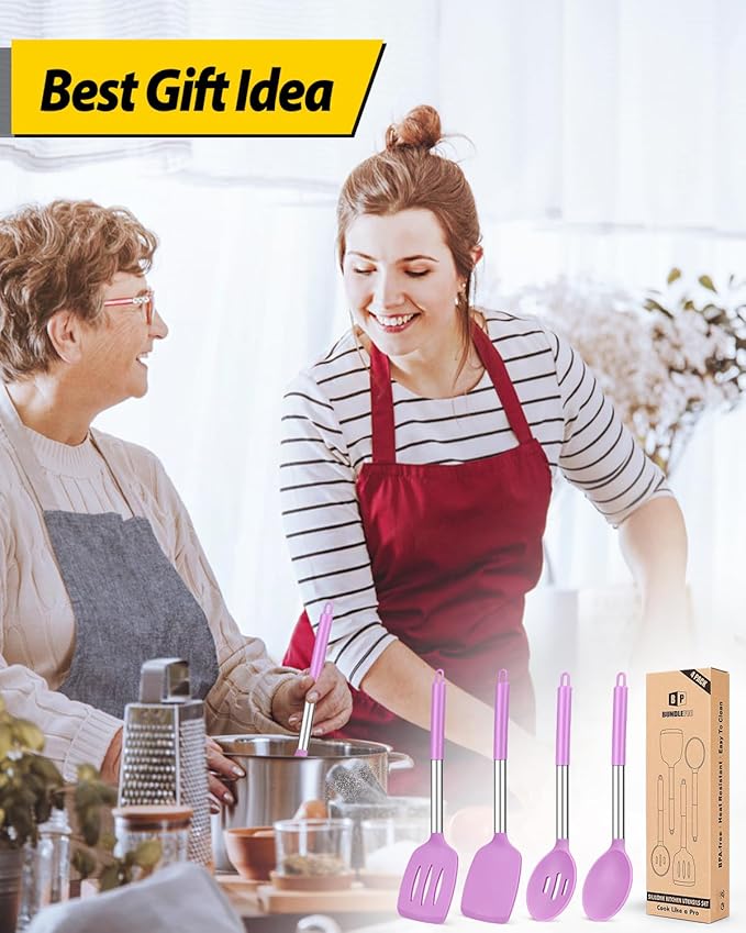 Pack of 4 Silicone Cooking Utensils Set, Non Stick Large Solid Spatulas, Heat Resistant Purple Slotted Spoons, Ideal BPA Free Kitchen Turners for Frying, Mixing,Serving,Draining,Turning,Stirring