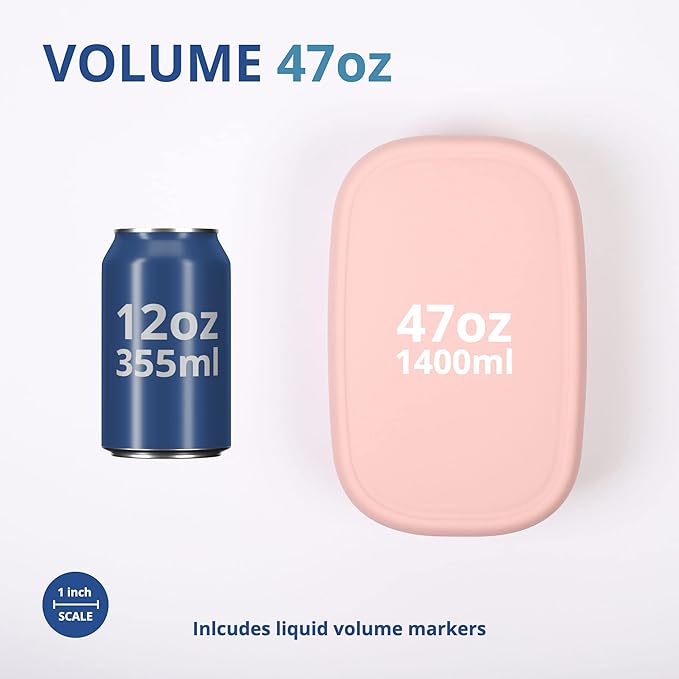 - Versatile and Durable - Our large silicone food container is ideal for storing lunch, leftovers, and snacks. It has liquid volume markers, and is temperature resistant (-40°F - 482°F), microwave friendly, unbreakable, easy to clean, and reusable.