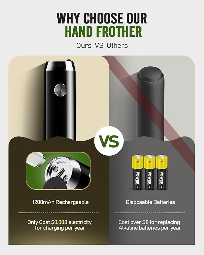 - USB-C Rechargeable for Long Battery Life: Unlike other battery-operated milk frother, this rechargeable milk frother has a built-in 1200mAh lithium battery, so there is no need to replace the battery frequently. This rechargeable foam maker can be fully charged about 3 hours for 2-3 months using(including USB-C charging cable). The white light flashes slowly when charging, and turns off after being fully charged.