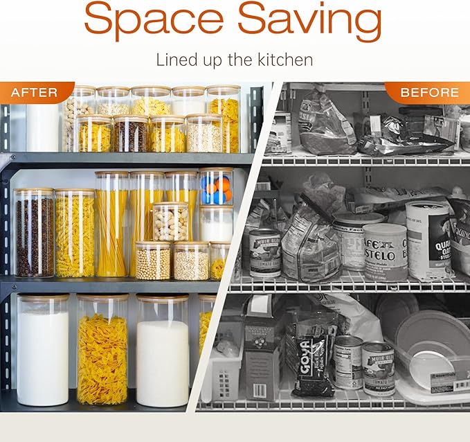 - HD Clear Glass Jar & Boho Decor: Special HD glass provide the most transparent texture, makes you can clearly see through the contents of glass storage jars and the remaining stock, then you can convenient to refill the foods that is about to be used up. The natural bamboo lids and HD clear glass canisters is a beautiful boho decor for your kitchen, pantry, bathroom, or bars, etc
