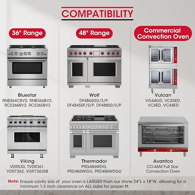- Extra Large Heavy Baking Stone: The baking stone measures 24"L x 18"W with 0.6” thickness and weighs approximately 16.9 lbs. Does not fit ovens having an interior depth of less than 17”. Please ensure your oven or grill’s cavity dimensions are LARGER than the stone (24"L x 18"W), allowing a minimum of 1-2 inches of clearance on ALL sides for proper fit and airflow. Remember to account for the space taken by the oven rack when measuring