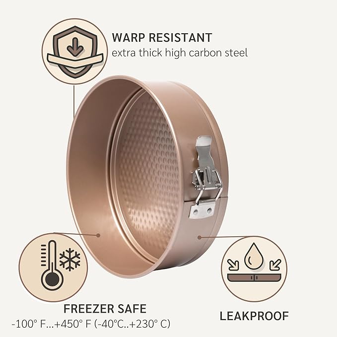 - 👍 Truly Nonstick for Easy Release – the superb nonstick coating guarantees quick and easy release of baked goods, making it simple to remove your cheesecake or cake without sticking. The springform design is easy to open and close for a picture perfect result!