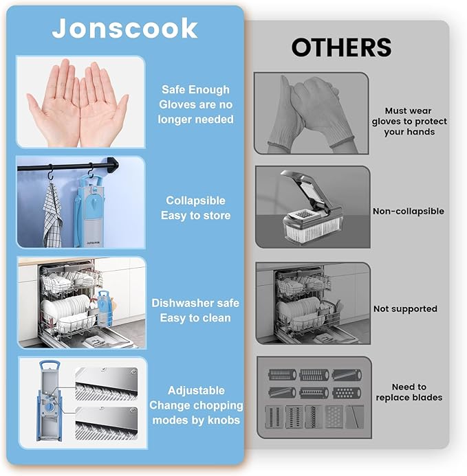 - 【Safe Vegetable Chopper】 - Protect Your Hands - Our Jonscook mandoline food slicer is designed with built-in blades. No contact with blades, which is safer that other slicers that need to change different blades. No need to wear the troublesome safety gloves. Safe and convenient, suitable for the elderly and children.