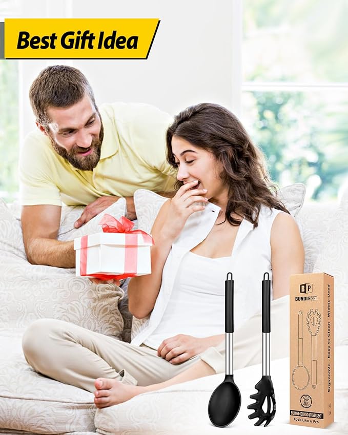 Silicone Pasta Fork and Cooking Spoon Set, Non Stick Kitchen Utensils for Cooking,Stirring,Serving Spaghetti, Soup, Sauce (BLACK)
