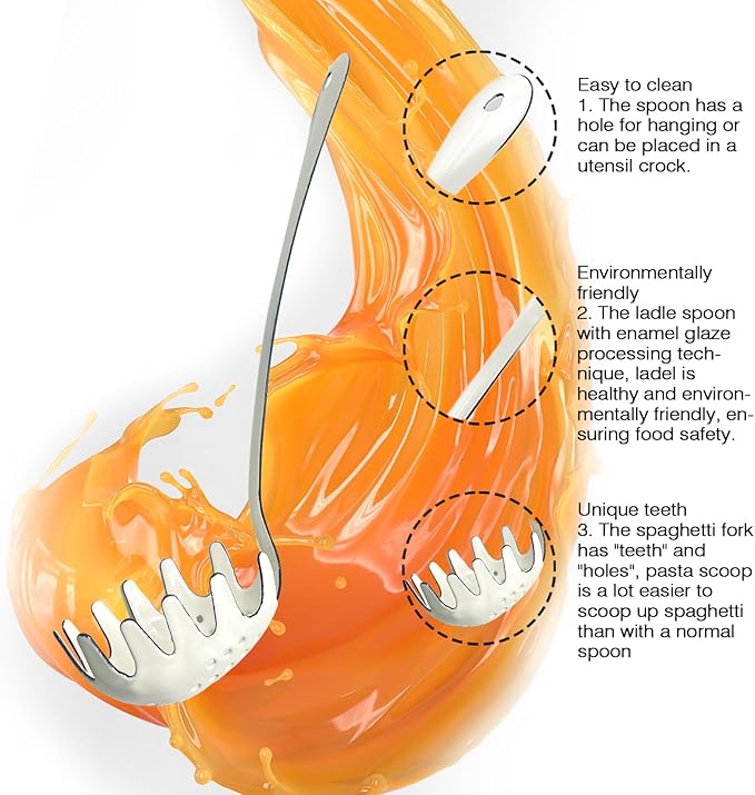 - SPOON WITH TEETH: The spaghetti fork has "teeth" and "holes", pasta scoop is a lot easier to scoop up spaghetti than with a normal spoon. The hole is useful to drain excess water, spaghetti spoon server is easy and quickly for your kitchen cookware.