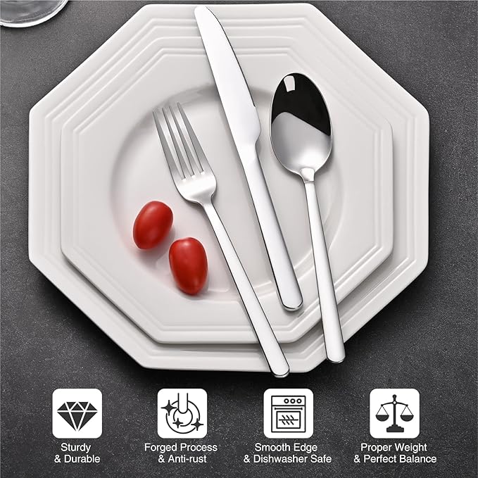 - 18/10 Stainless Steel & Comfortable: Our silverware set is crafted from high quality 18/10 stainless steel, ensuring a perfect balance, sturdiness, and corrosion resistance. The thickened handles are ergonomically designed for a comfortable grip and are highly durable, resisting bending. Ideal for gourmet enthusiasts and home - entertainers who value both comfort and quality in their dining experience