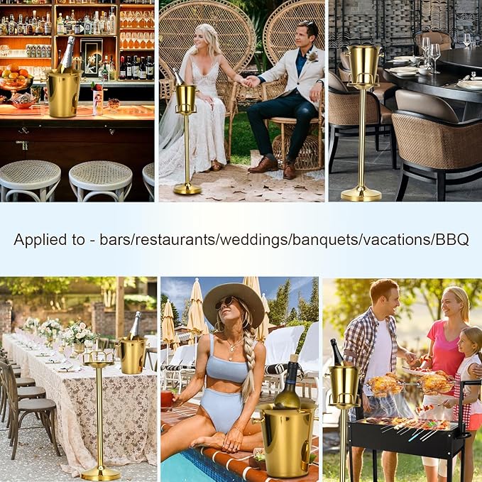 - 【Detachable bracket】A champagne ice bucket with a stand will not occupy the space on the desktop. Of course, you can remove the red wine cooler from the ice bucket stand. This standing ice bucket is not only suitable for indoor use, but can also be moved to outdoor use