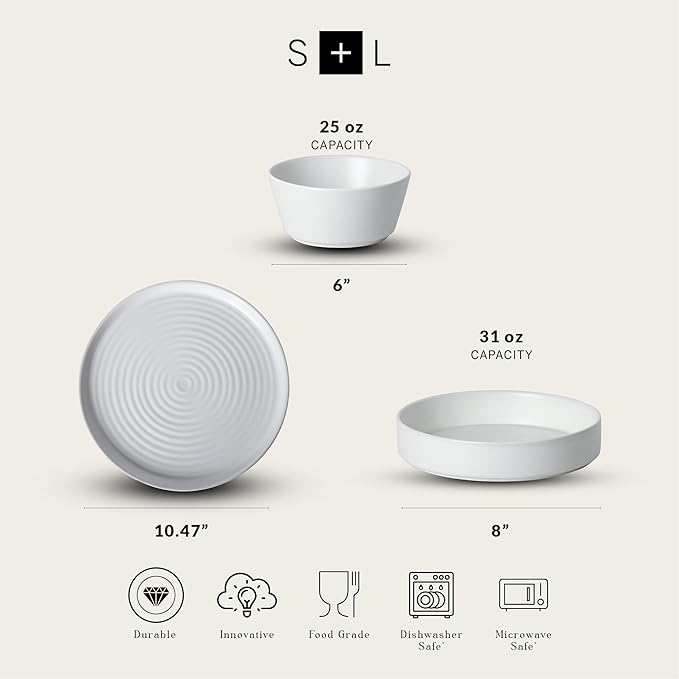 Stone Lain Elica 12-Piece Modern Dinnerware Set Stoneware, Plates and Bowl Sets for 4, White