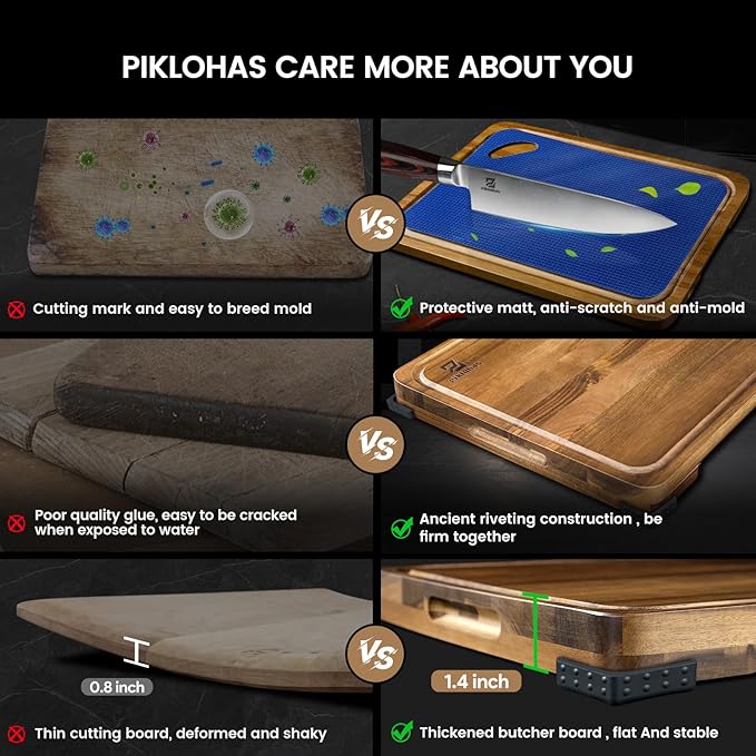 - [Acacia Wood Cutting Board with Juice Groove] Crafted from acacia wood, our cutting board is a paragon of stability, boasting remarkable resilience. Its smooth surface is gentle on knife edges, while the U-shaped juice groove efficiently captures any liquid runoff, ensuring the cleanliness and orderliness of your countertop