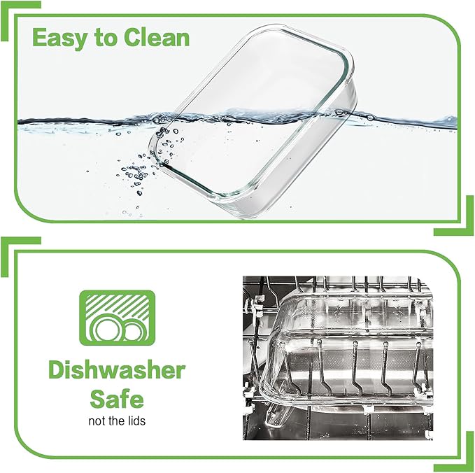 - [BPA Free & Easy to Clean] BPA-Free plastic locking lid is safe as well as leakproof. Crystal clear borosilicate glass is easy to clean without absorbing stains or smells. They are dishwasher safe to instead of hand washing. Also the silicone seal is removable for your to clean and dry it. In order to prevent seal sticking to the containers, please must wash the lids and containers before put them away