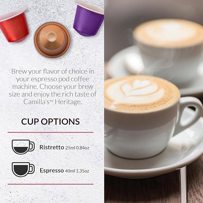 - Perfect Cup, Every Time: Each coffee capsule brews 0.85 oz/25 ml or 1.35 oz/40 ml. Just pop the pod of coffee in your original espresso pod machine, choose your brew size, and enjoy the rich taste of Camilla’s Heritage.