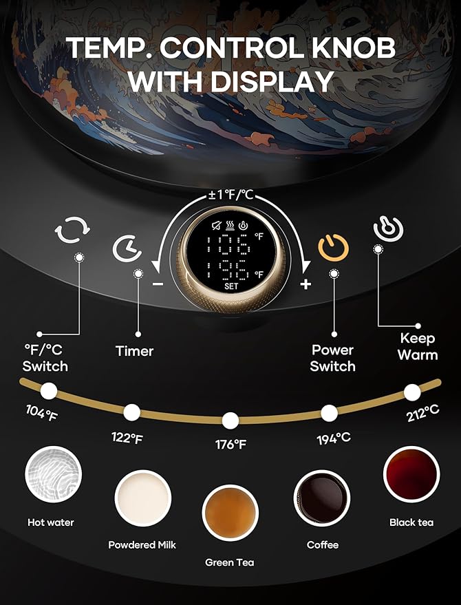 - ±1℉ Precision Control: Smart base with pro-grade sensor keeps water within ±1℉, delivering barista-level accuracy for coffee or tea.