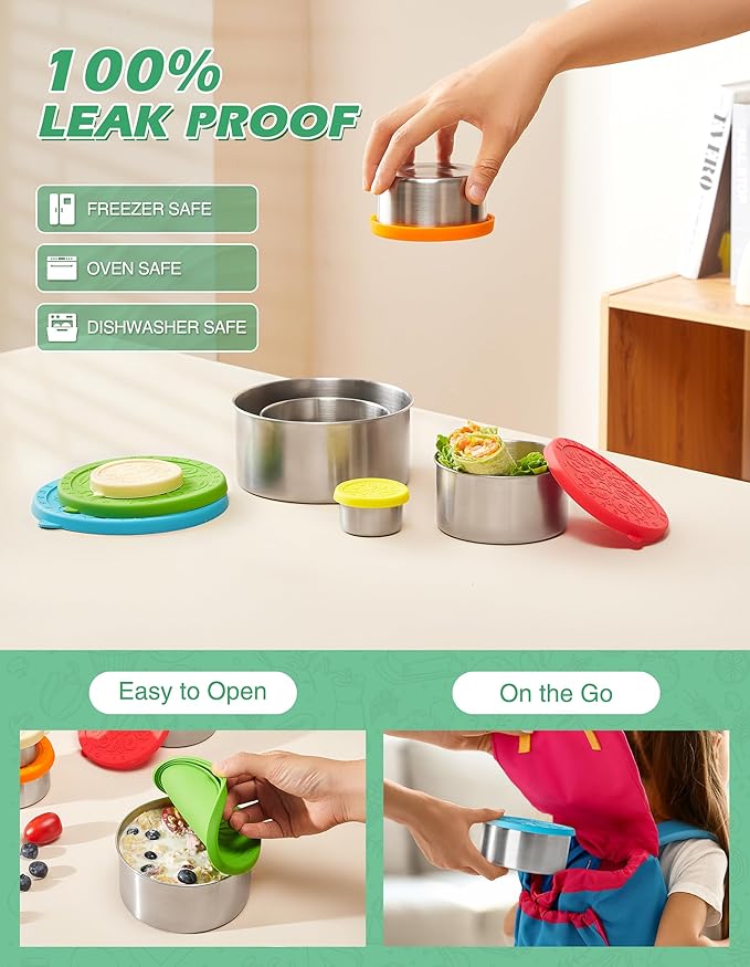- Leak-Proof Silicone Lids: These lids are flexible, easy to remove. The food-grade silicone lids seal tightly to prevent spills and keep food fresh, even liquids like soups and dressings.