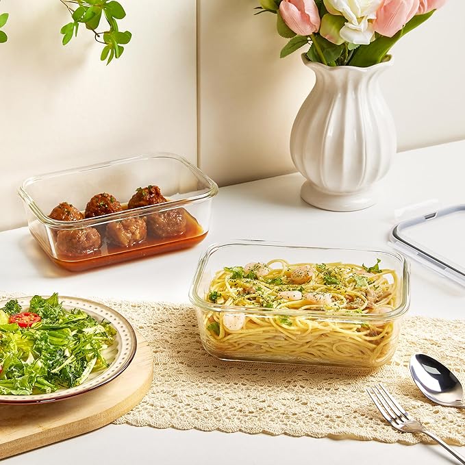 - 【Premium Glass & BPA Free】The glass containers are made of high quality borosilicate glass, making it safe for food storage. It is suitable for storing fruits, vegetables, salads, cereals, meals, meat, pasta, soups. It is a good choice for preparing meals at home, easy to get a healthy life.