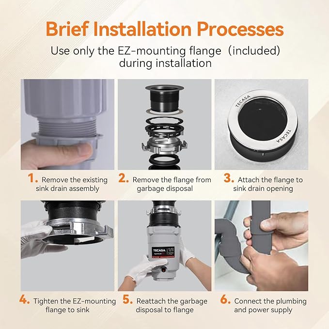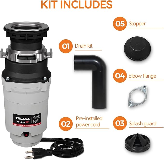 - ๐/๐ ๐๐: The TECASA 1/2 HP garbage disposal is ideal for most home kitchens, fitting standard 3-1/2 inch sink openings. It comes with a pre-installed 39" power cord for quick and easy electrical connection. The compact, space-saving design features a DC motor that delivers instant, enhanced torque for efficient grinding operations.