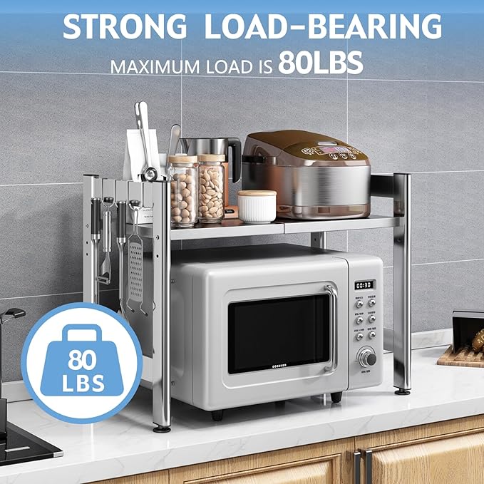 - 【Premium and Rust-proof】Our microwave shelf is made of high-quality thickened stainless steel material, which is sturdy, rust proof, wear-resistant and durable. This microwave stand can provide up to 80 pounds of load-bearing capacity, enough to accommodate microwaves, ovens, toaster, kitchen utensils and seasonings