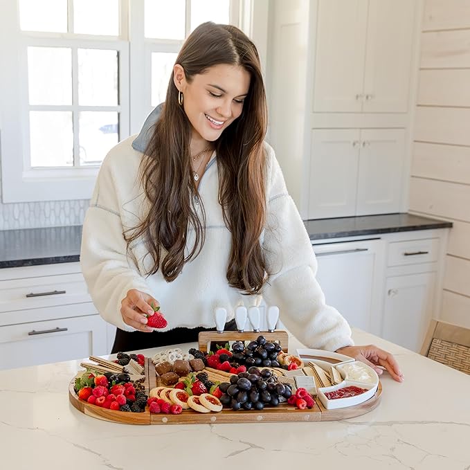 - ๐๐'๐ ๐ฎ ๐๐ผ๐บ๐ฝ๐น๐ฒ๐๐ฒ ๐ฆ๐ฒ๐ ๐ณ๐ผ๐ฟ ๐๐ฎ๐๐ ๐๐ป๐๐ฒ๐ฟ๐๐ฎ๐ถ๐ป๐ถ๐ป๐ด: The wooden serving tray comes with a host of useful charcuterie board accessories, including 4 stainless steel cheese knives and 3 white ceramic serving dishes, providing all of your hosting essentials. Impress your guests with this large charcuterie board at your next party - Motherโs Day, Memorial Day, Fatherโs Day, Independence Day, Thanksgiving, Christmas, Super Bowl, Galentines, Passover, Hanukkah, the opportunities are endless!