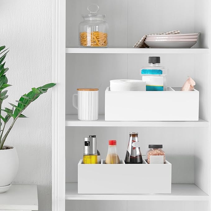 - Customizable compartments: The wooden pantry storage bin has 3 removable dividers, making it easy to adjust the size of the slots for your needs. The dividers are easy to insert and remove. They would work well in the kitchen, cupboards, pantries, kids' snacks, and drawers. You could even use them to organize a medicine cabinet or bathroom cabinet