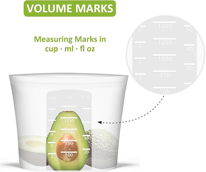 - 【THOUGHTFUL & ECONOMICAL】You'll receive 4 Medium size 1.5quart/50.7fl.oz/6cup/1500ml, 2 Small size 33.8fl.oz/4cup/1000ml(Quart size for sandwich) and 2 Extra Small snack size 16.9fl.oz/2cup/500ml. Reusable silicone food storage bags come with clearly volume marks in cups, milliliters and fluid ounces for easy use. Translucent body easy to see what's inside, though not in crystal clear. Plus, one silicone bag can reduce up to 300+ single-use plastic bags a year, helping to create a waste-free world