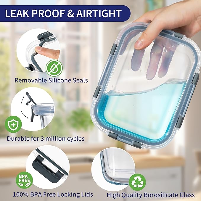 - Airtight Locking Lids: The glass containers for food storage is designed with removable silicone seals and 4-hinge snap locks to ensure no leaks or spills, these lids are easy to open and close. glass food containers with lids are used for meal prep, office lunches, leftovers, portion control, bringing to the gym, picnics, travel and more
