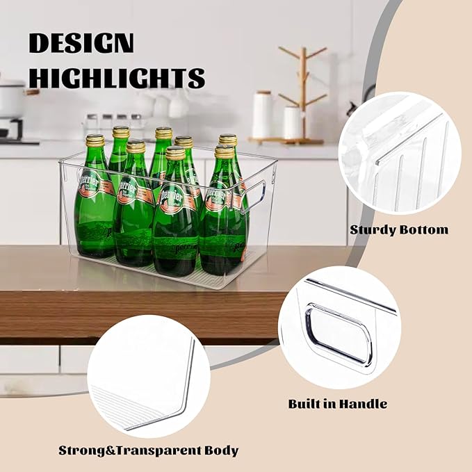 - 【STACKABLE, CLEAR, AND EASY TO HANDLE】 Featuring a transparent body for quick content identification, these bins keep your items visible and organized. Built-in handles allow for easy access and portability. Their stackable design maximizes vertical space, making them ideal for efficient kitchen organization and home tidiness.