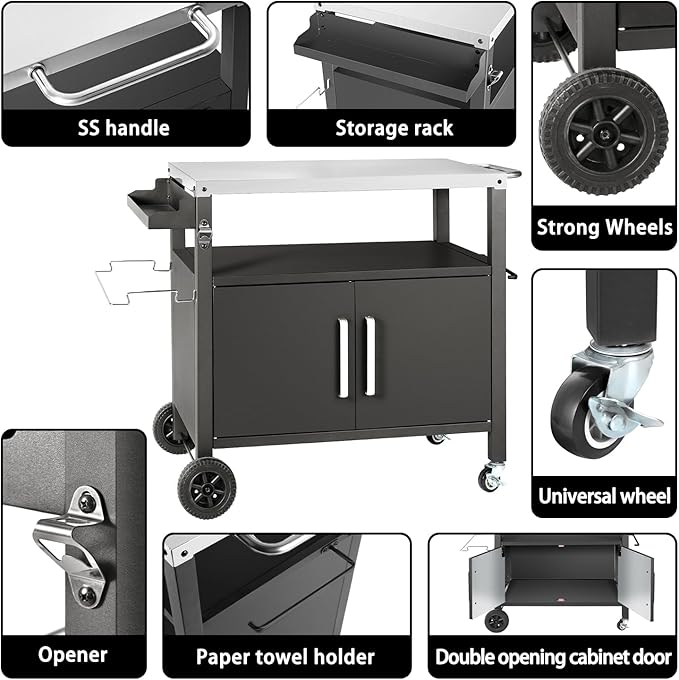 Grill Cart Table with Big Storage Cabinet, Movable Outdoor Dining Cart Pizza Oven Stand, Kitchen Cart Island Multifunction Food Prep Table Stainless Steel Surface